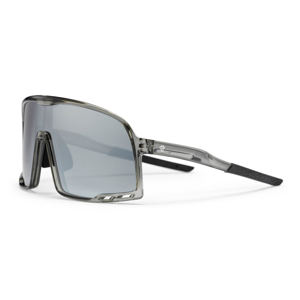 Con lente polarizada y marco gris transparente de gran tamaño fabricado con plástico 100% reciclado.