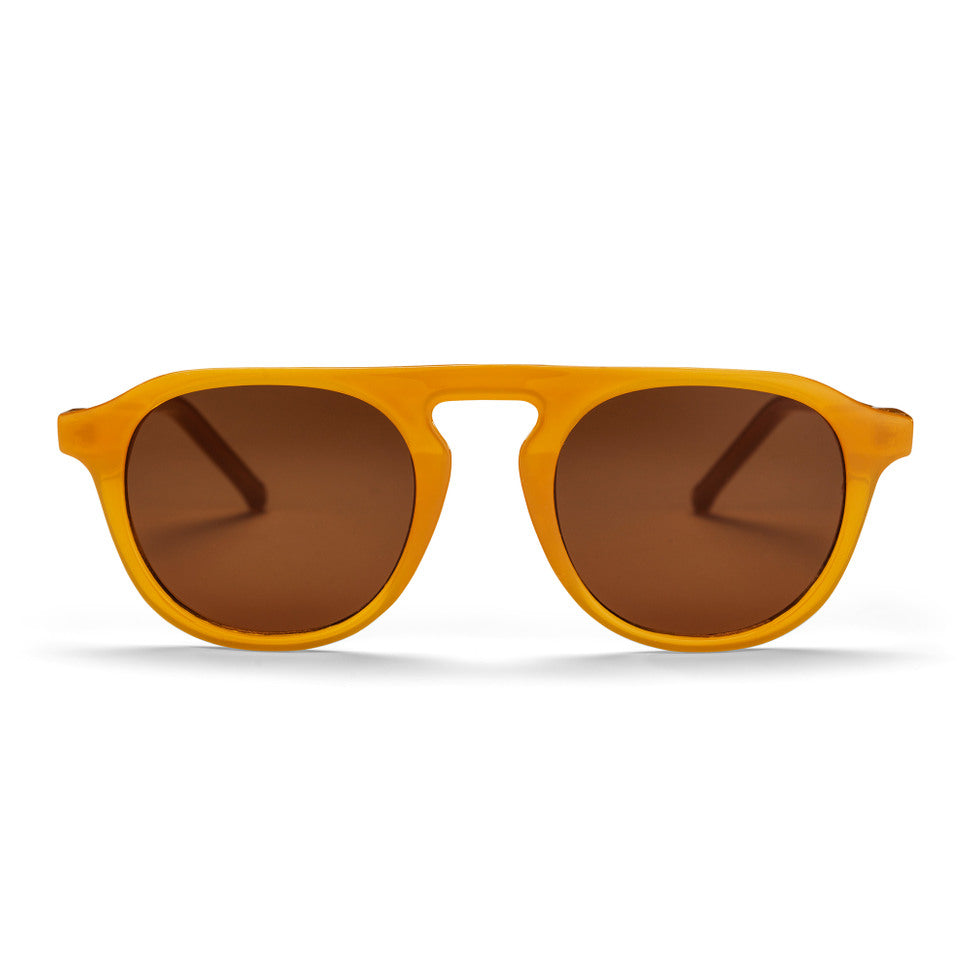 Un marco color mostaza hecho de plástico reciclado, combinado con un lente cafe.