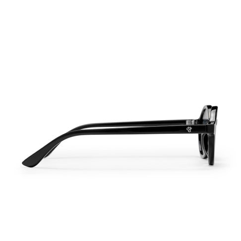 Un marco negro fabricado con plástico 100 % reciclado y lente negro.